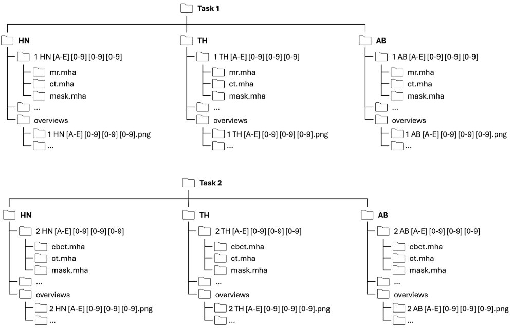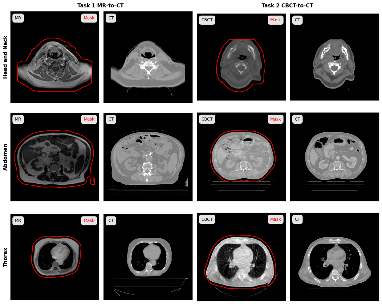 This challenge dataset contains imaging data of patients who underwent radiotherapy in the head and neck, thorax or abdomen region. Overall, the population is predominantly adult and no gender restrictions were considered during data collection. For Task 1, the inclusion criteria was the acquisition of a CT and MRI during treatment planning while for Task 2, acquisitions of a CT and CBCT, used for patient positioning, were required. Datasets for Task 1 and 2 do not necessarily contain the same patients, given the different image acquisitions for the different tasks.